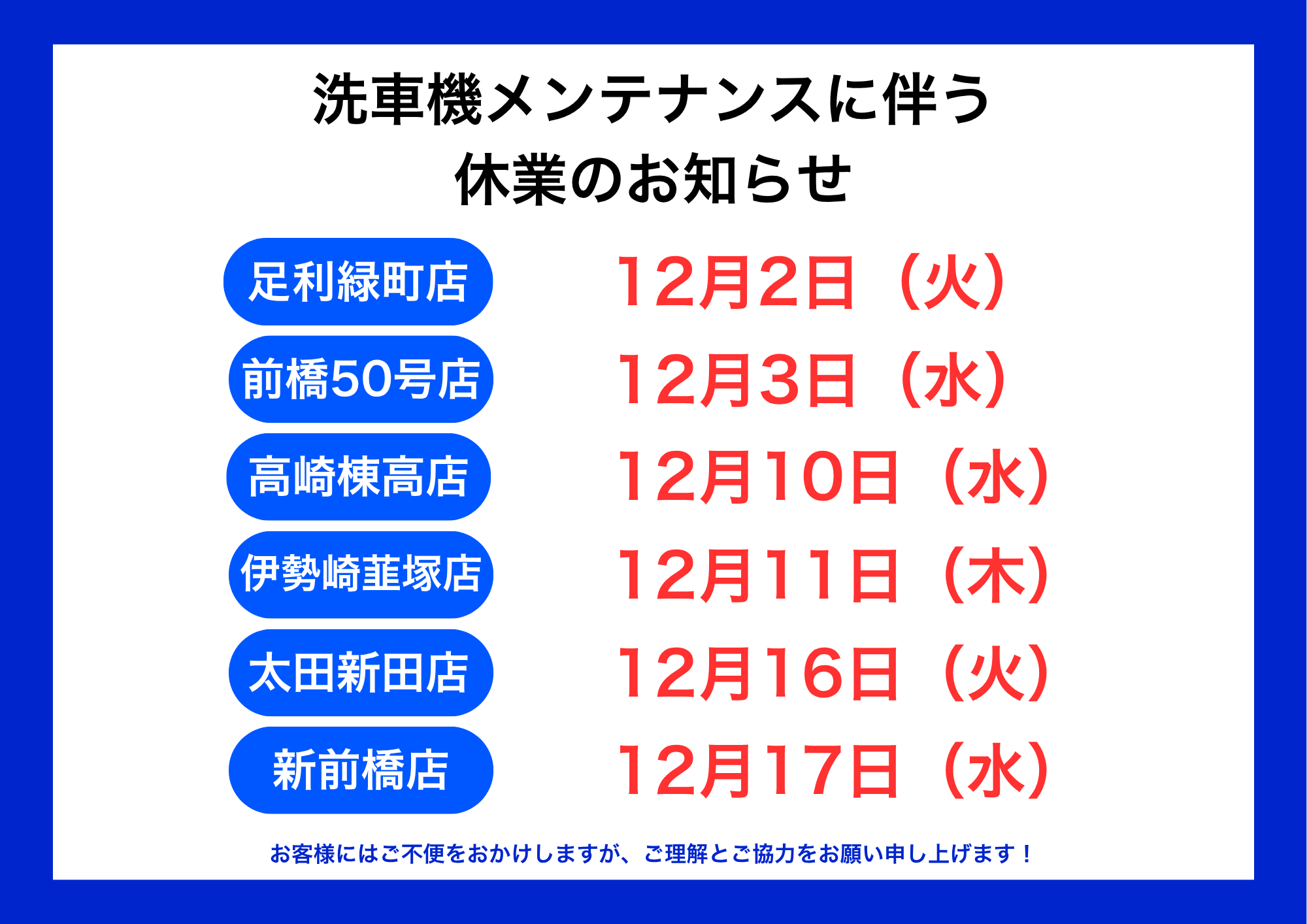 以下の日程で休業させていただき、洗車機のメンテナンスを実施いたします。